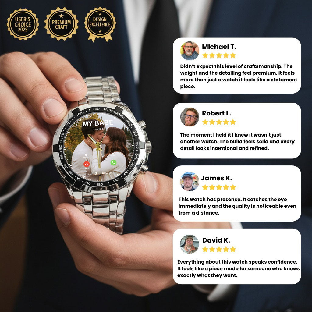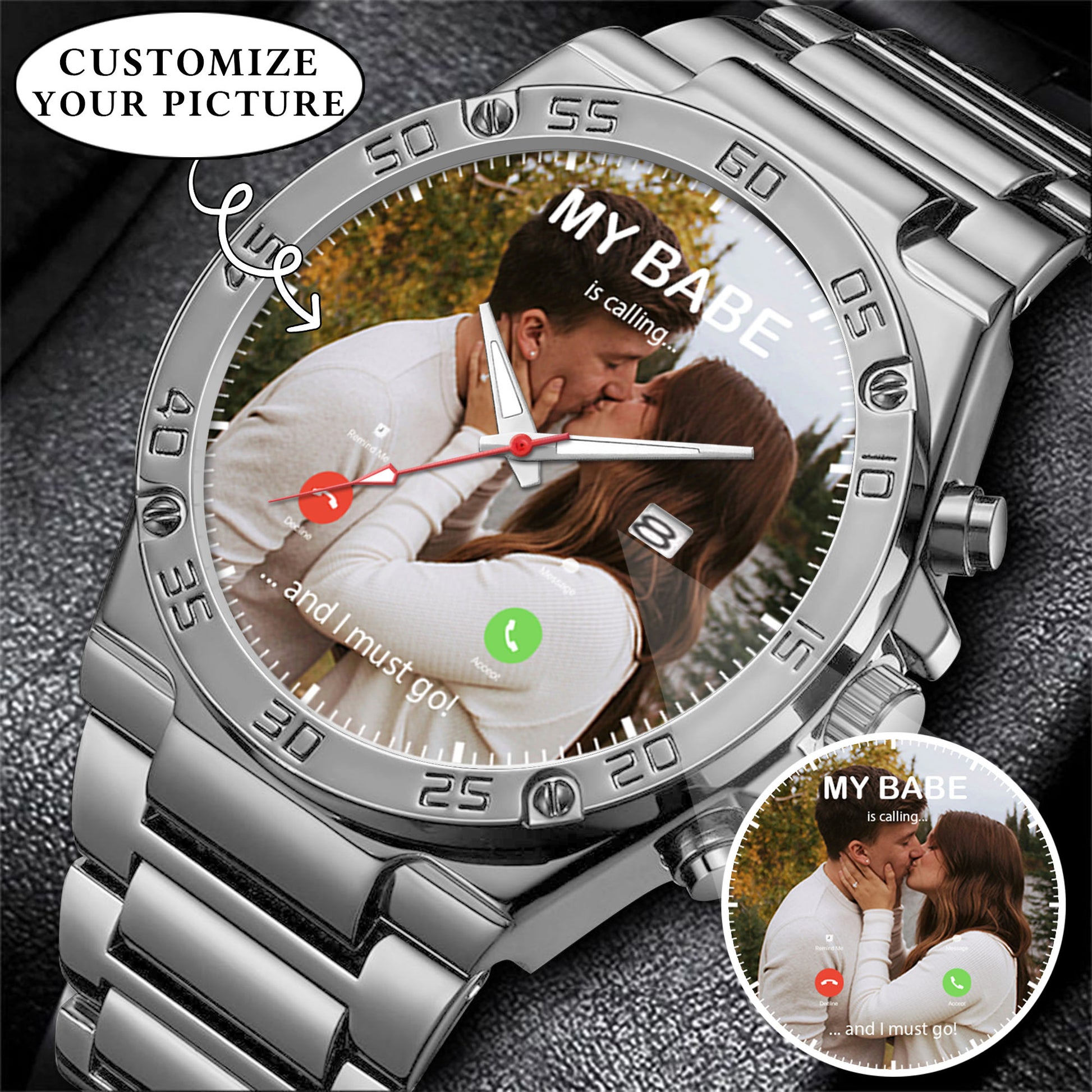 This custom-designed stainless steel watch allows you to upload your own photo, turning a precious moment into a timeless accessory. The dial features a romantic “My Babe Is Calling” layout with call icons and personalized text, making the watch feel like a sweet reminder that love is always calling you — no matter where you are.